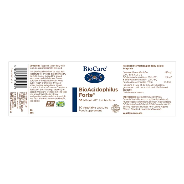 BioAcidophilus Forte është një përzierje me potencë të lartë e kompleksit unik LAB4 të baktereve të gjalla, të studiuara klinikisht.