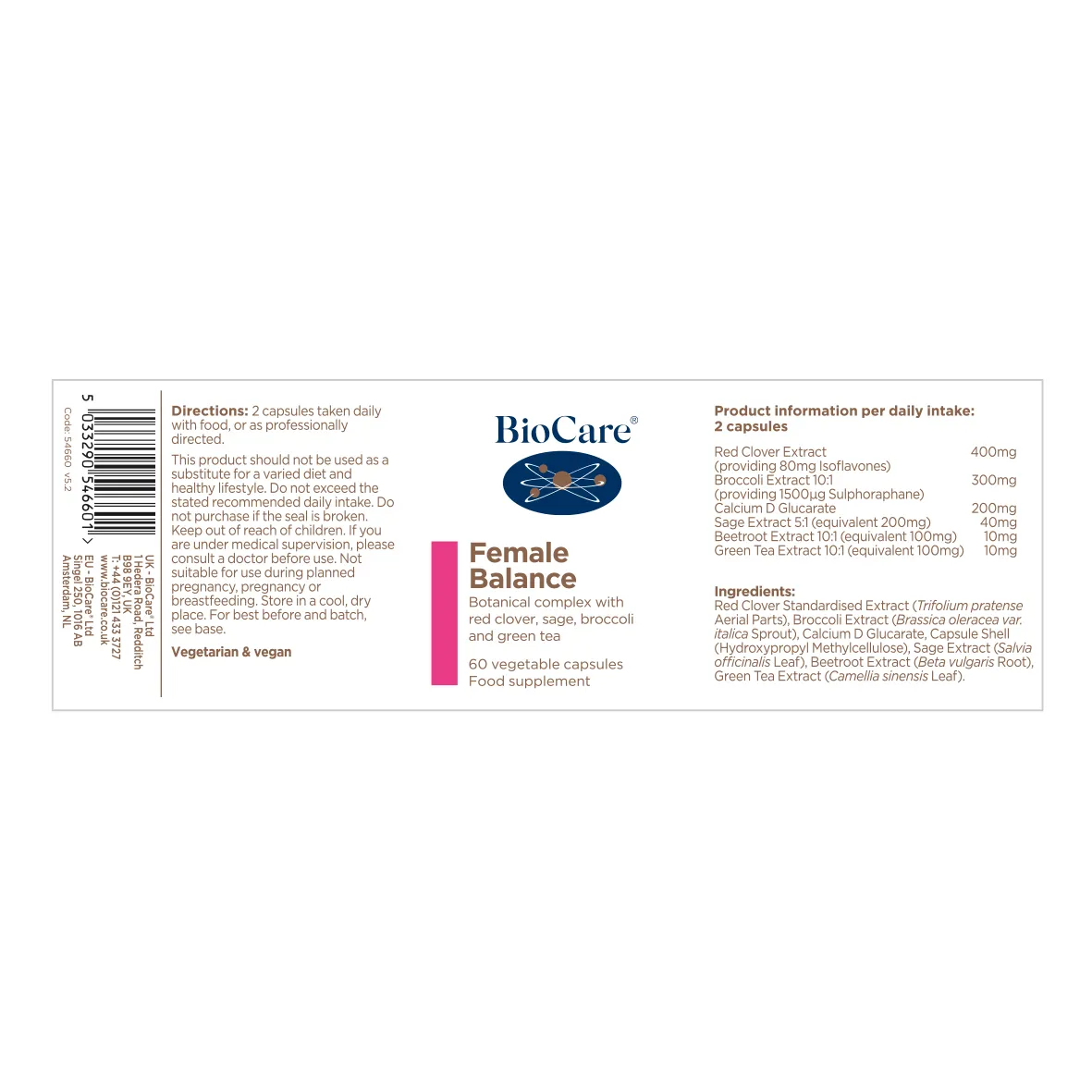 Ekstrakt i Standardizuar i Tërfilit të Kuq (Pjesët Ajrore të Trifolium pratense), Ekstrakt i Brokollës (Lakrat e Brassica oleracea var. Italica), Glukarat D i Kalciumit, Predha e Kapsulës (HPMC), Ekstrakt i Sherebelës (Gjethja e Salvia officinalis), Ekstrakt i Panxharit (Rrënja Beta vulgaris), Çaji i Gjelbër Ekstrakt (Fletë Camellia sinensis).