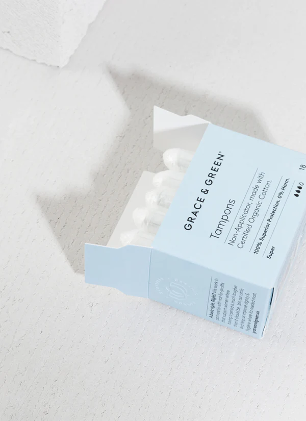 Tampona organikë të mbështjellë me letër të riciklueshme. Krijuar vetëm me përbërës natyral dhe të qëndrueshëm.
